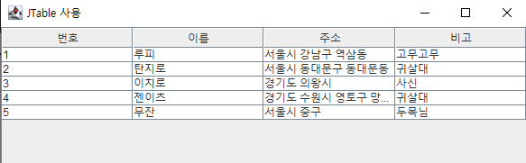 dtm.addRow(new String[]{"5","무잔","서울시 중구","두목님"});