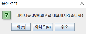 switch(JOptionPane.showConfirmDialog(null, "데이터를 JVM 외부로 내보내시겠습니까?")) {