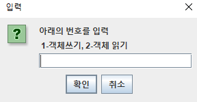 String inputMenu = JOptionPane.showInputDialog("아래의 번호를 입력\n 1-객체쓰기, 2-객체 읽기");