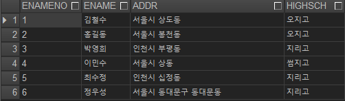 ADDR이 서울시로 시작하면서(AND), ENAME이 3글자인 데이터들만 조회되었고