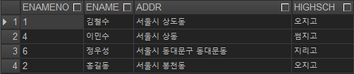 ADDR이 서울시로 시작하면서(AND), ENAME이 3글자인 데이터들만 조회되었고