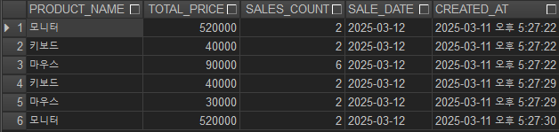 6. sales 테이블에서 '2025-03-12' 에 판매된 상품의 상품명, 총가격, 판매건수를 집계하여
