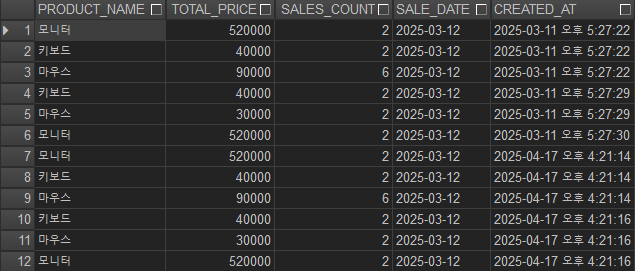 VALUES ('모니터', 520000, 2, TO_DATE('2025-03-12', 'YYYY-MM-DD'), SYSDATE);