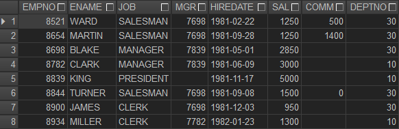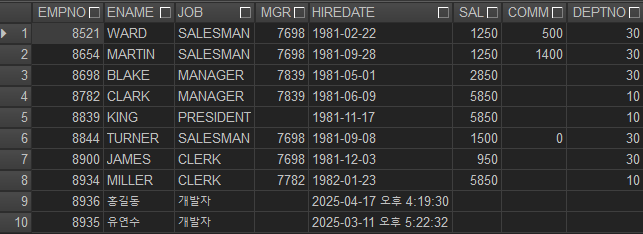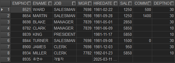 - IN (...): 여러 조건을 한 번에 비교할 때 사용 (ex. WHERE deptno IN (10, 30)