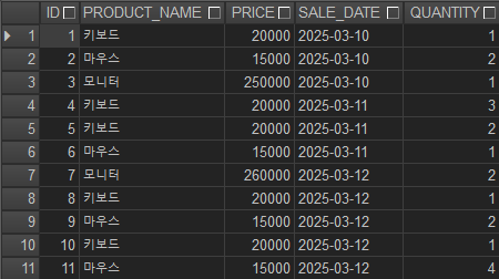 번호: 4, 상품명 : 키보드, 가격: 20000, 판매일 2025-03-11 수량 : 3