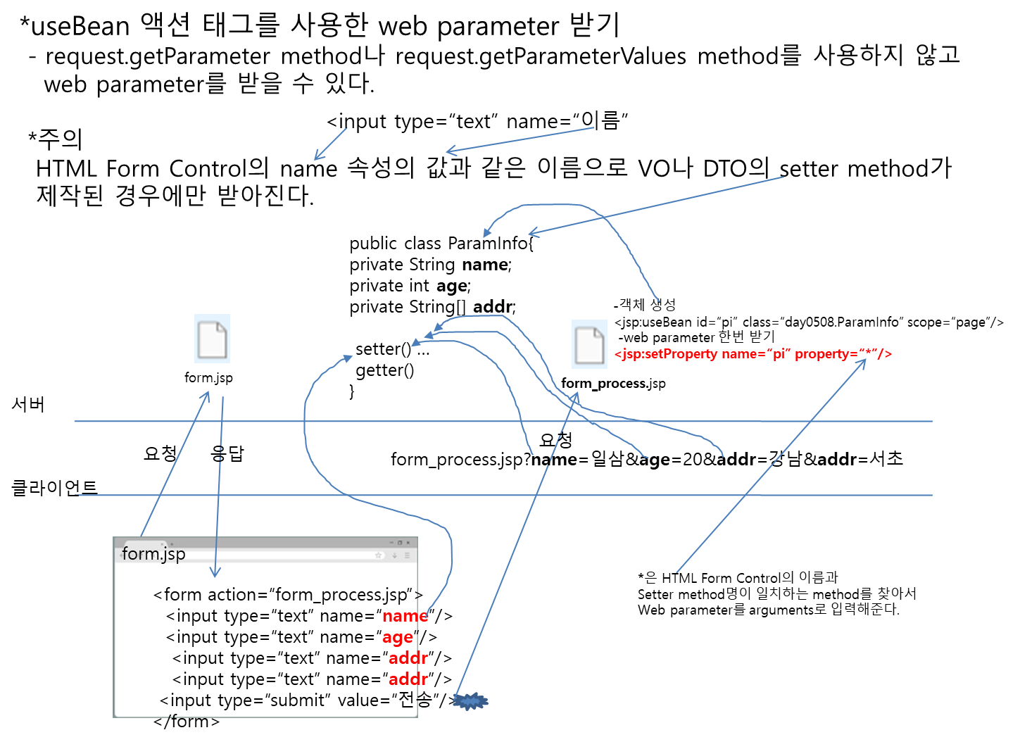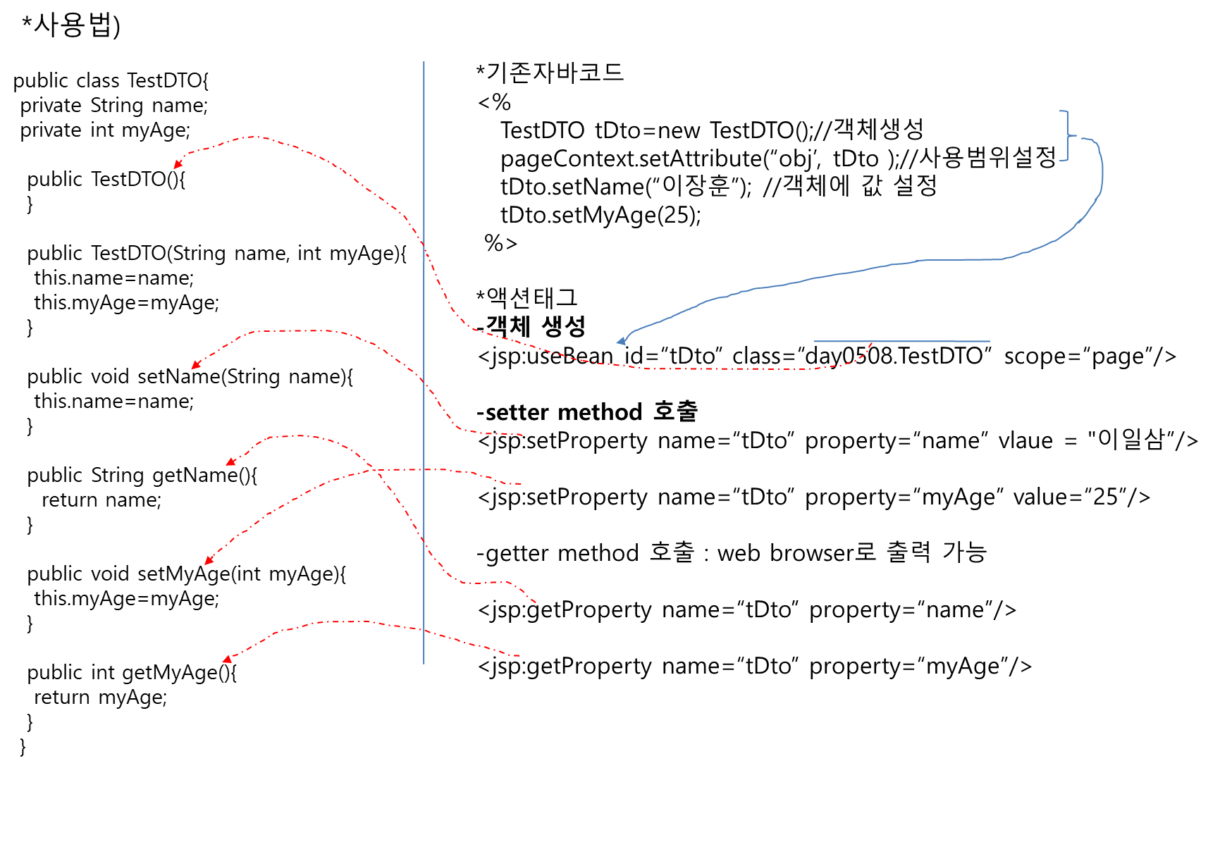- <jsp:setProperty>, <jsp:getProperty>와 함께 사용.