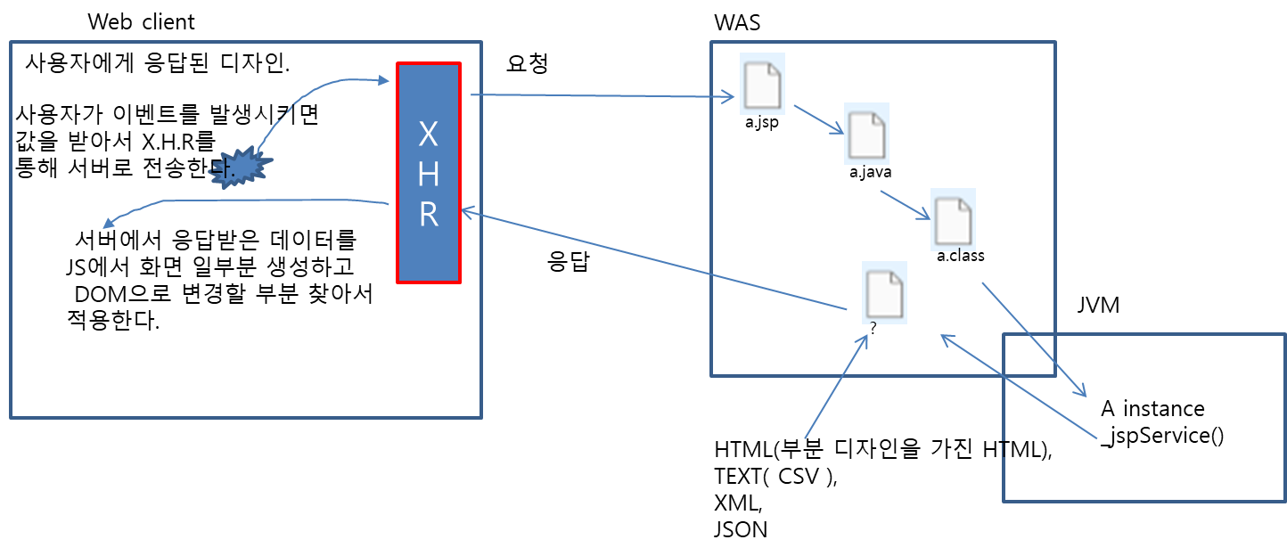 - XMLHttpRequest 자바스크립트 객체가 핵심 객체.