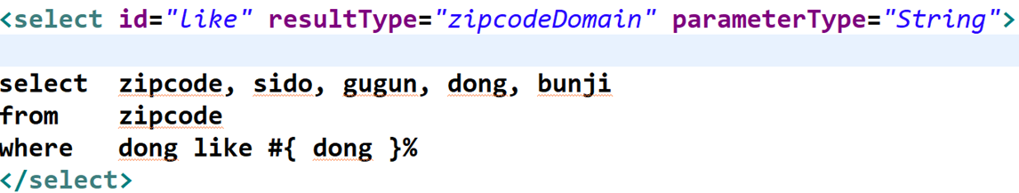 <select id=“아이디” resultType=“단일형,Domain,DTO” parameterType=“단일형, DTO, VO”>