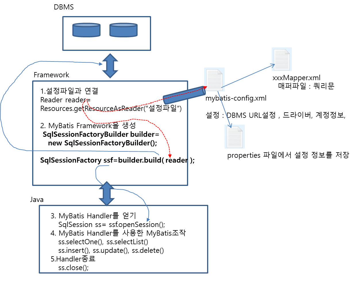 -SqlSessionFactoryBuilder : 설정파일과 연결한 Stream을 입력받아, DB연결관리,