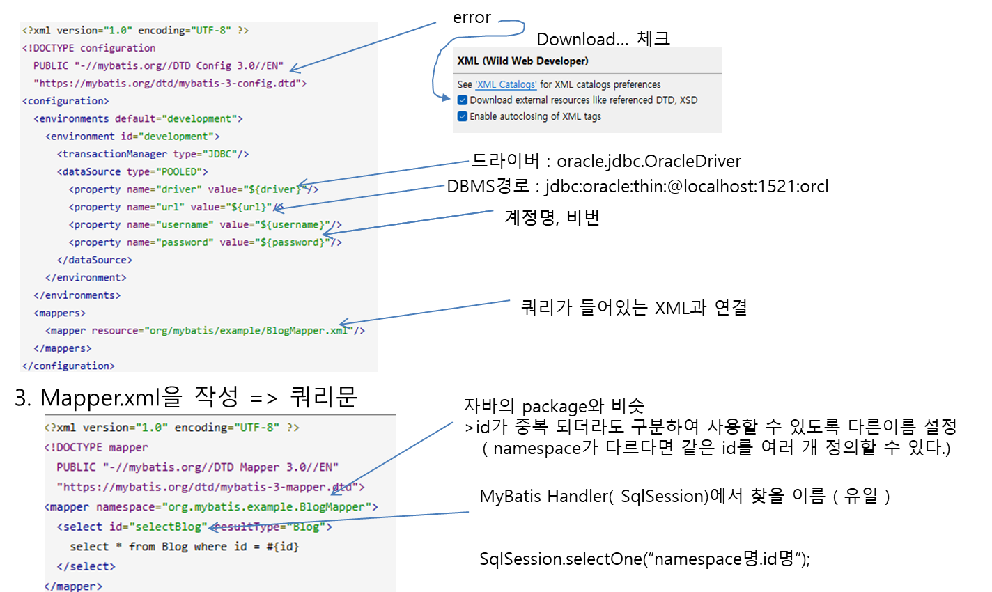 2.환경설정용 XML작성 ( mybatis-config.xml )=> 드라이버, URL, 계정정보, Mapper연결