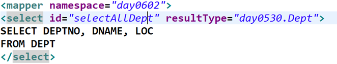 <select id=“아이디” resultType=“단일형,Domain,DTO” parameterType=“단일형, DTO, VO”>