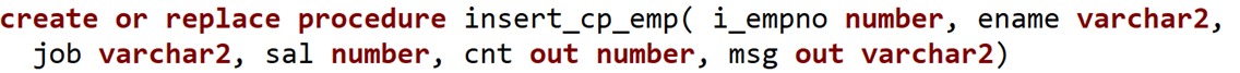 create or replace procedure 프로시저명( 매개변수 in 데이터형,,,,,, 매개변수 out 데이터형,,, )