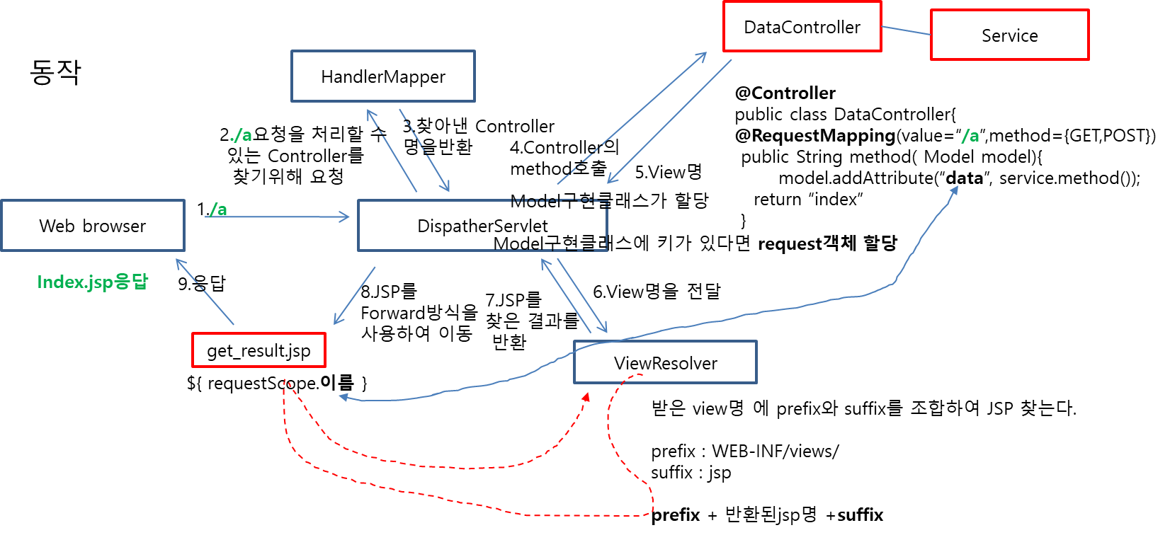 - 웹에 요청처리, 웹 파라메터 처리, 관계유지객체사용, scope객체 사용, view페이지명 설정,